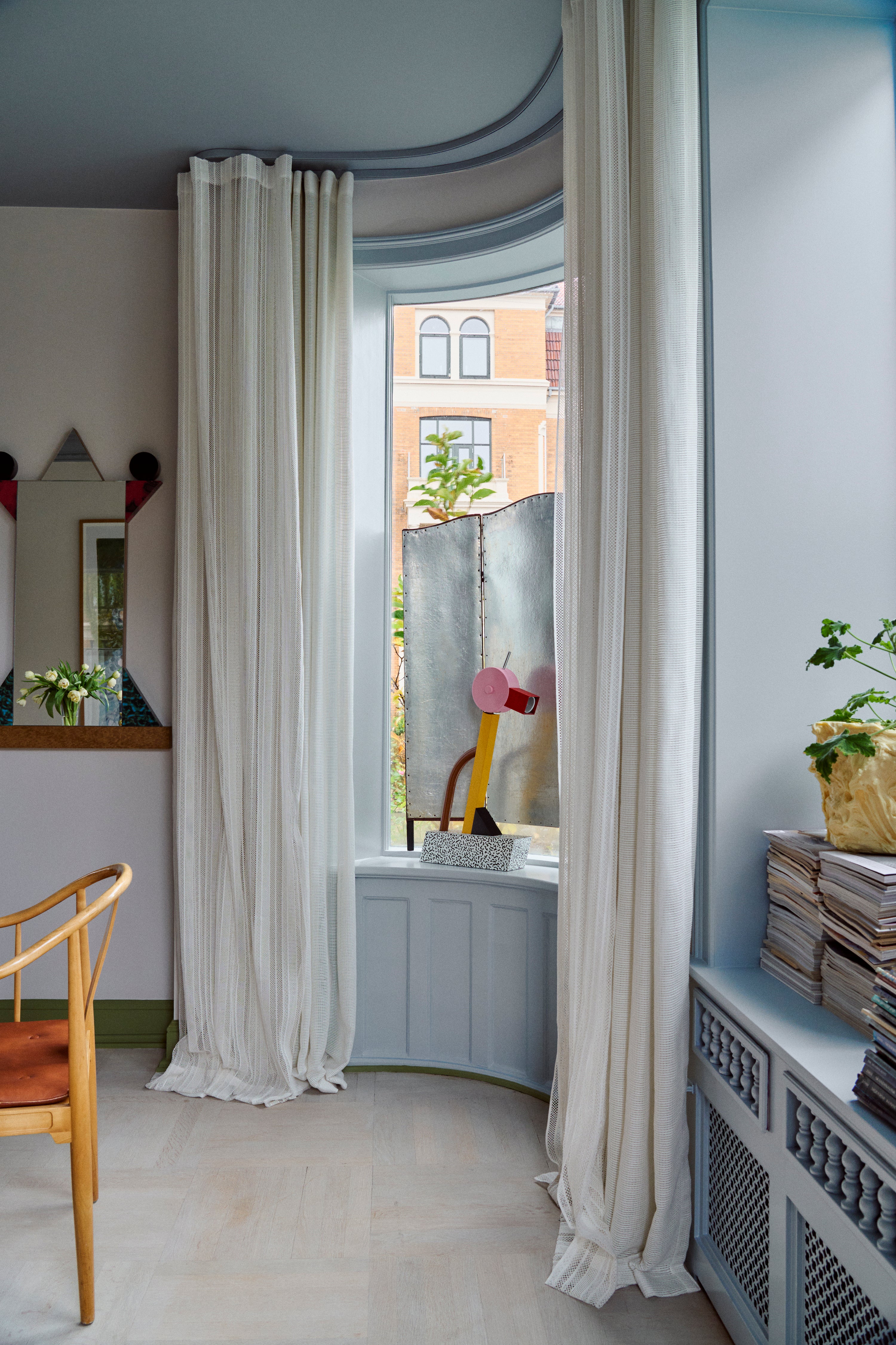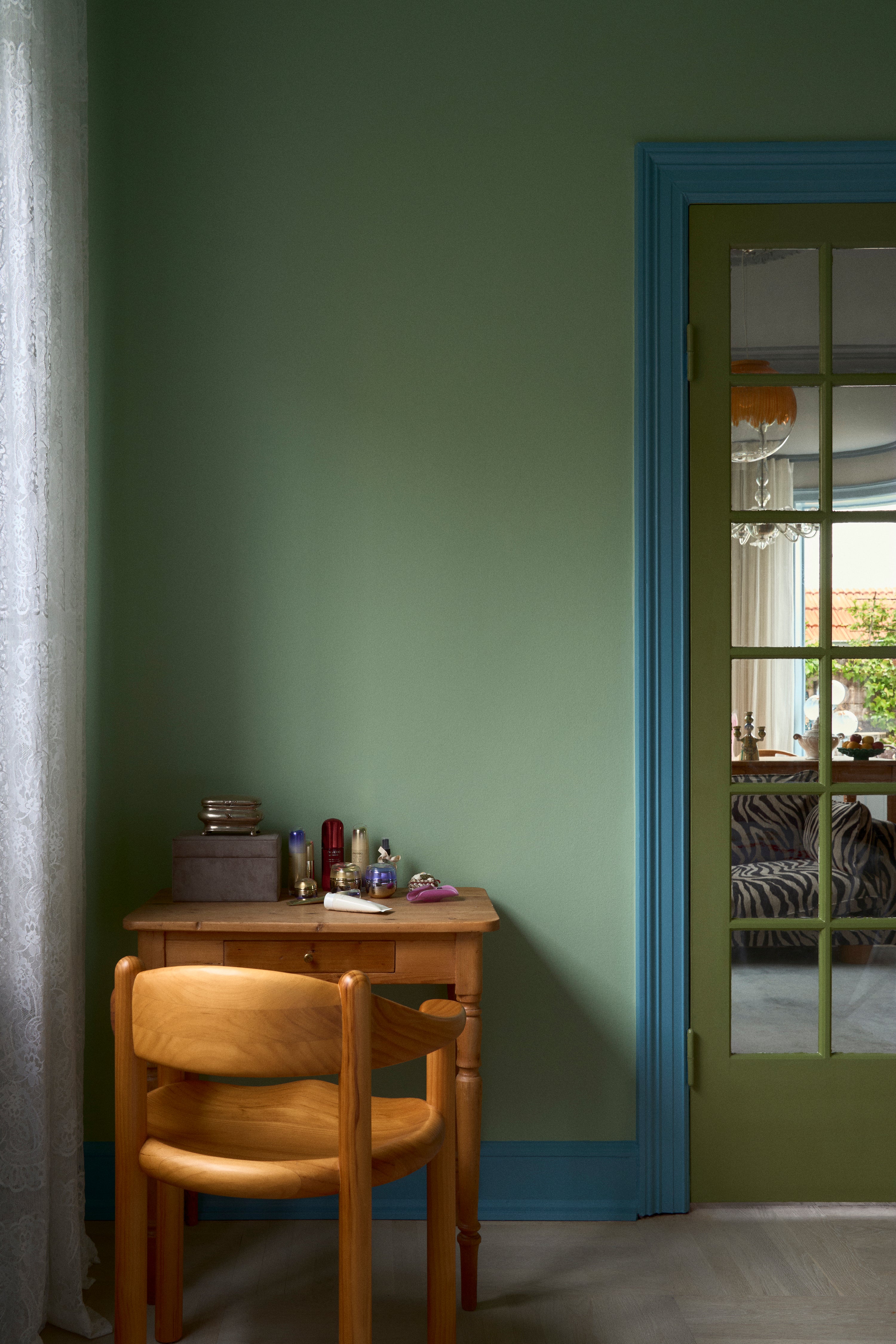 The home features a various yet precise blend of Blēo tones: NO DE 06 Shadow Blue by Note (Design Studio) on the ceilings; BA OS 17 Moss by Barber Osgerby on panels, door frames and the radiator; YV KO 23 Water by Yvonne Koné on selected panels and frames; NO AR 17 Shifting Sands by Norm Architects across the main living spaces; Griegst 03 Swirl by Griegst in the window alcove; Griegst 07 Lia by Griegst on the bedroom walls and ceiling, DA CH 08 Berlin + DA CH 09 Berlin by David Chipperfield in the kitchen, and CE BA 11 Jeorge Silver on the wardrobe.