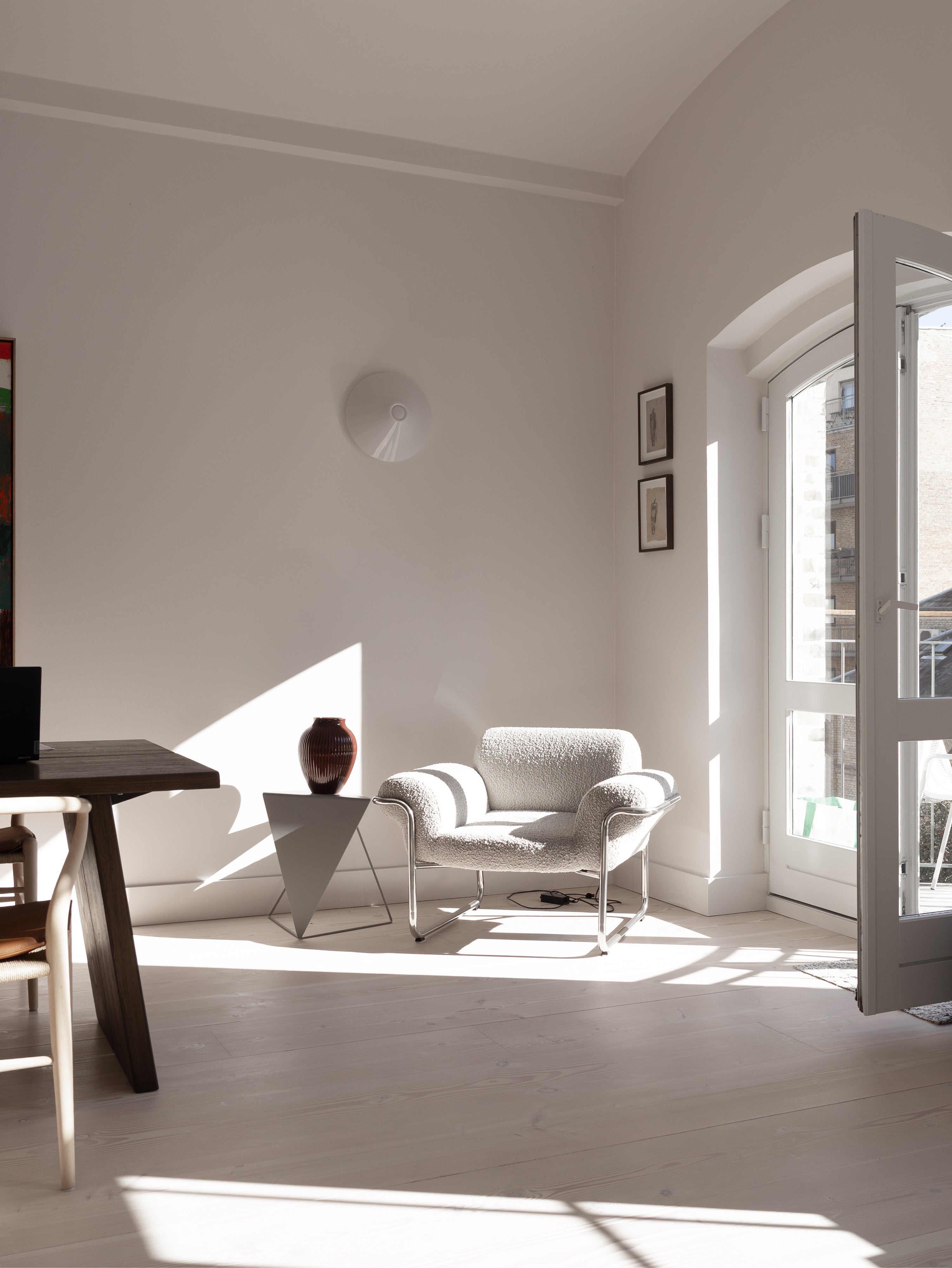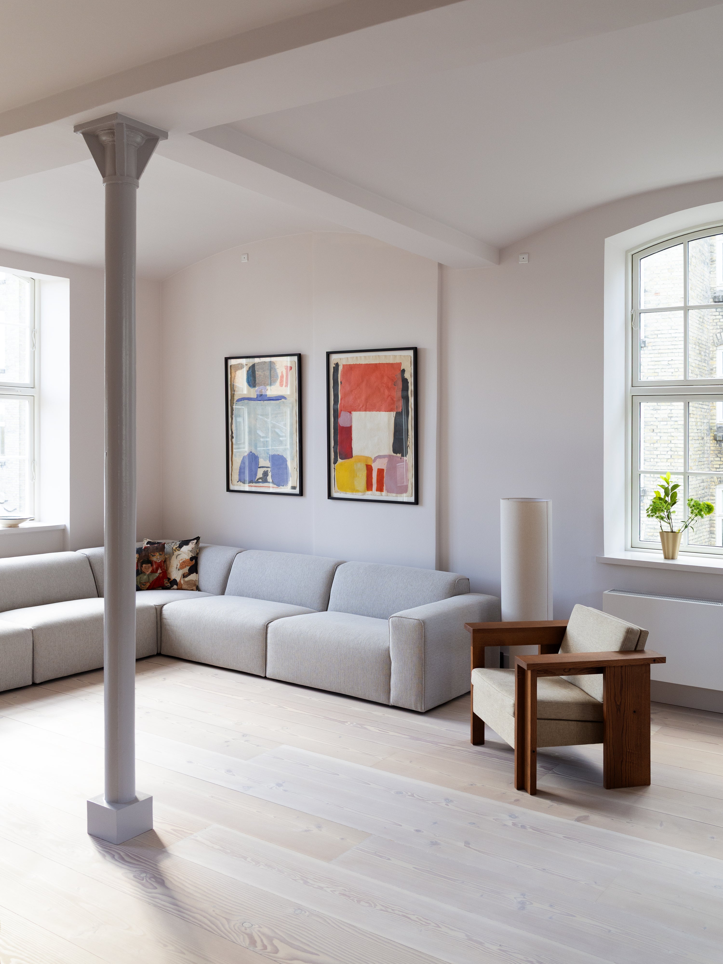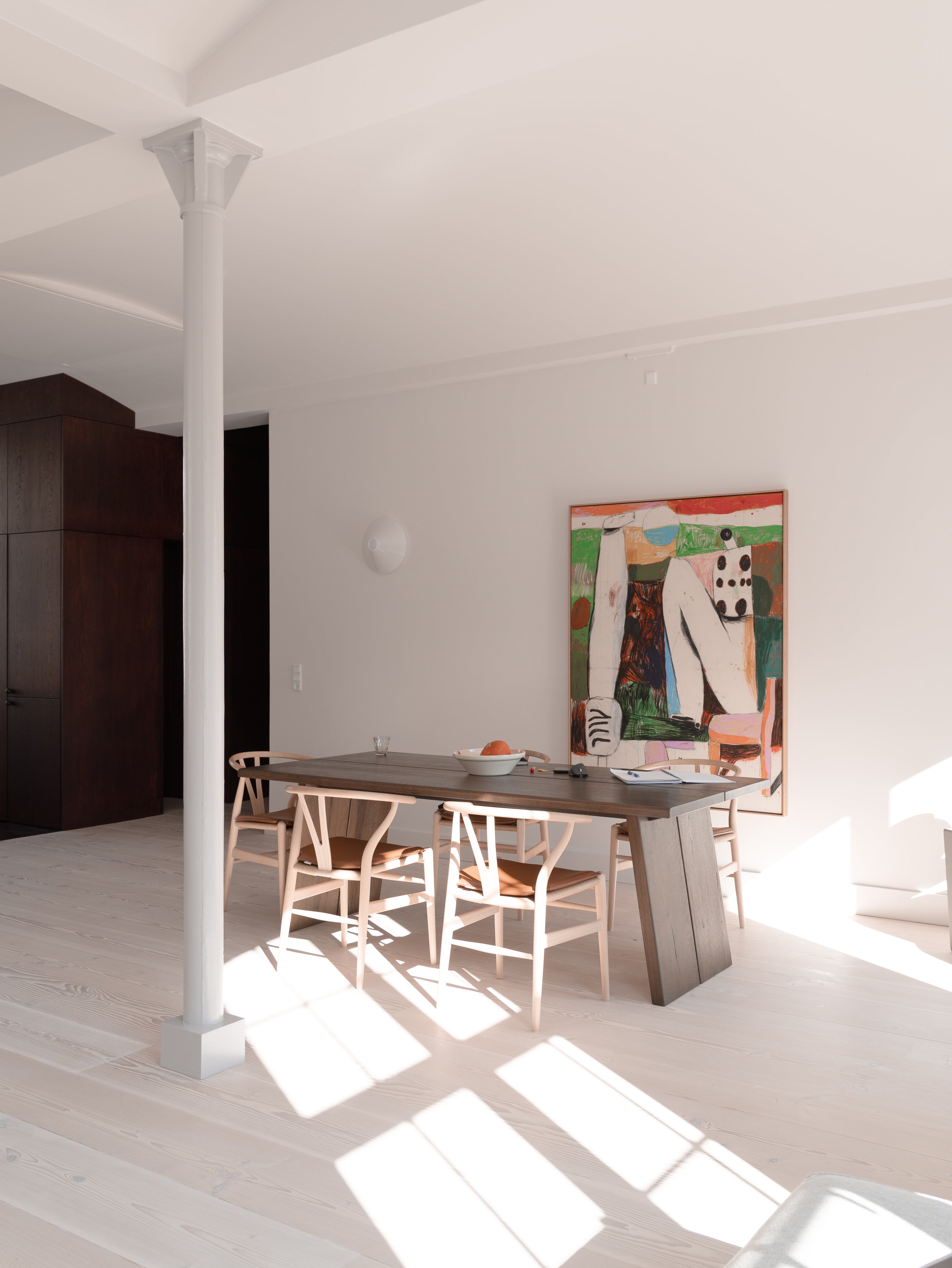 In the renovation of an apartment in Østerbro, Copenhagen, Antenna Works focused on opening the existing plan while introducing new layers of intimacy and contrast. The result is a generous kitchen and living area anchored by two exposed steel columns — once purely structural, now central to the space’s rhythm and atmosphere.