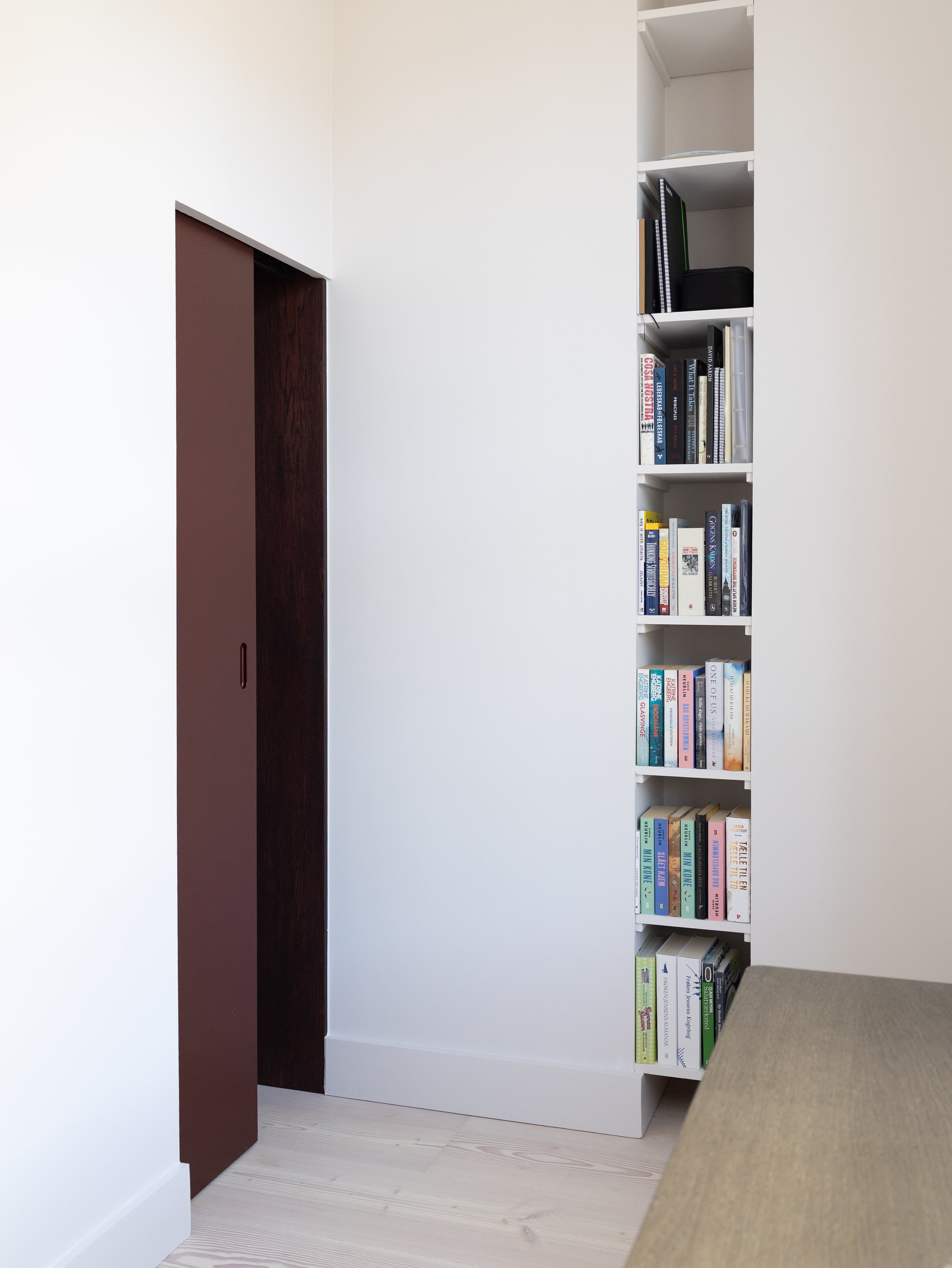 A deep red linseed oil floor grounds the interior, tactile and quietly expressive against the steel fronts. The colour extends upward to form a built-in cabinet that merges kitchen, wardrobe, and storage into a single architectural gesture. On the walls, JO PA 13 Gypsum by John Pawson for Blēo introduces a warm mineral tone whose soft pinkish undertones echo the red wood and deepen the dialogue between materials. The hue binds the space together — adding light, calm, and cohesion.