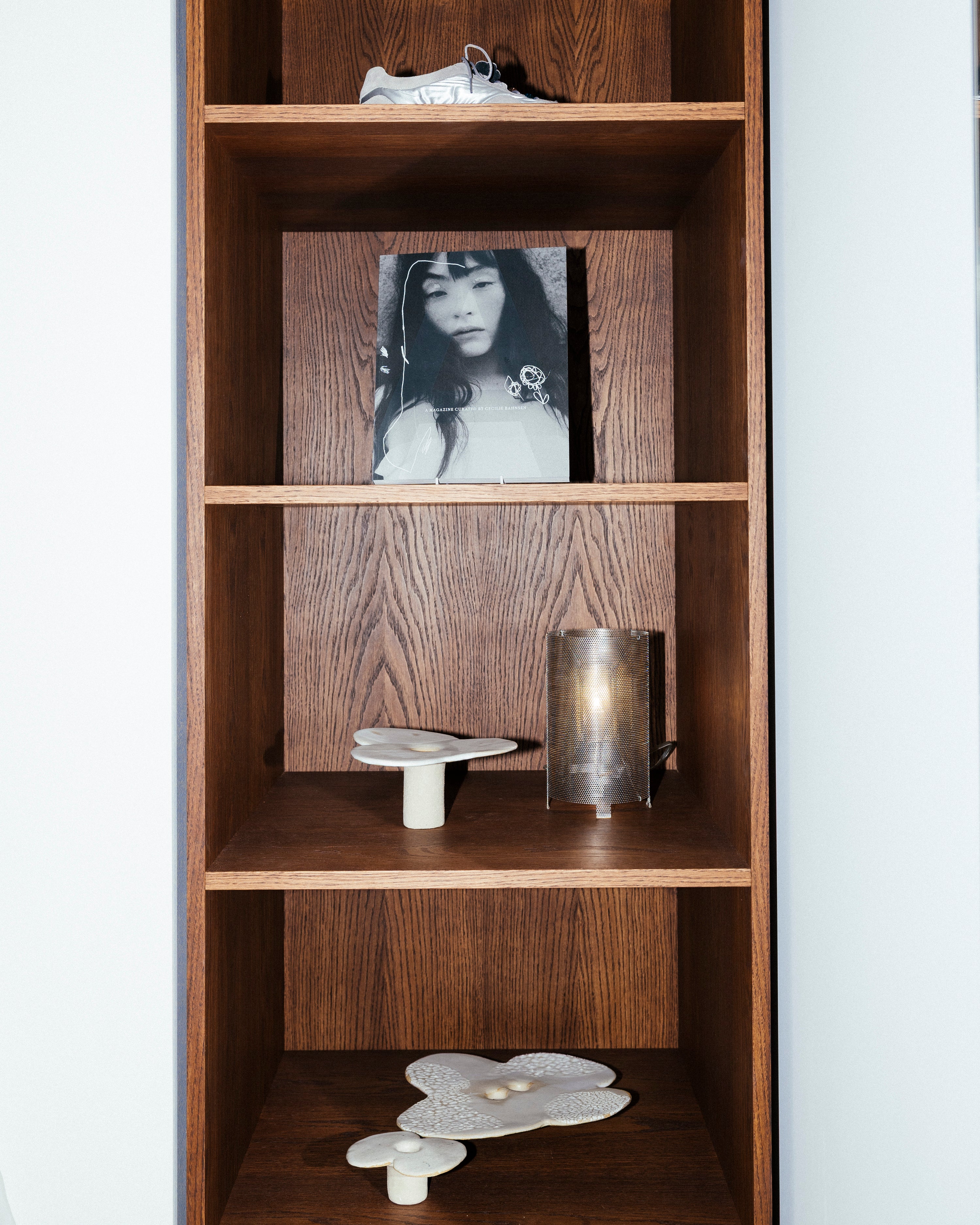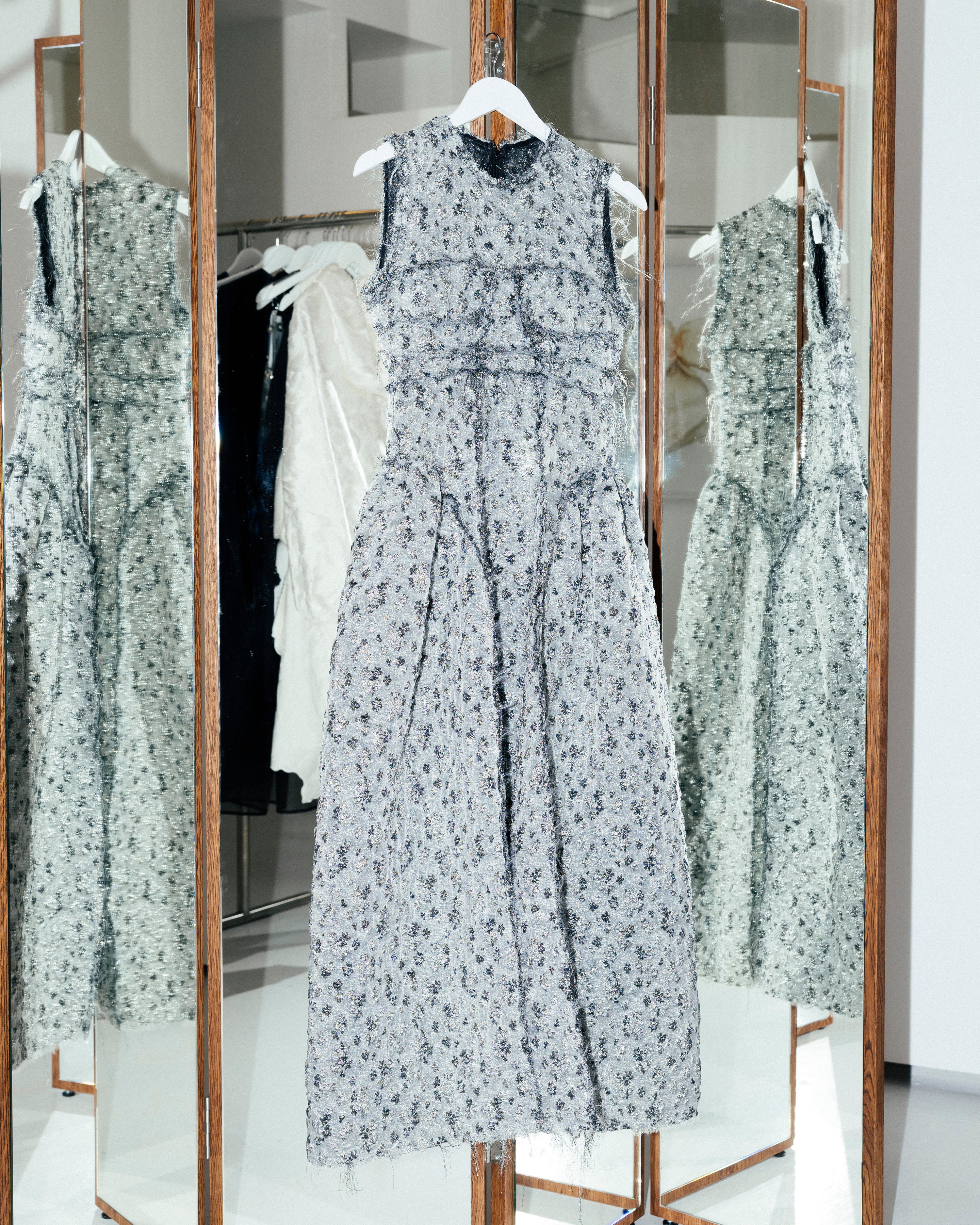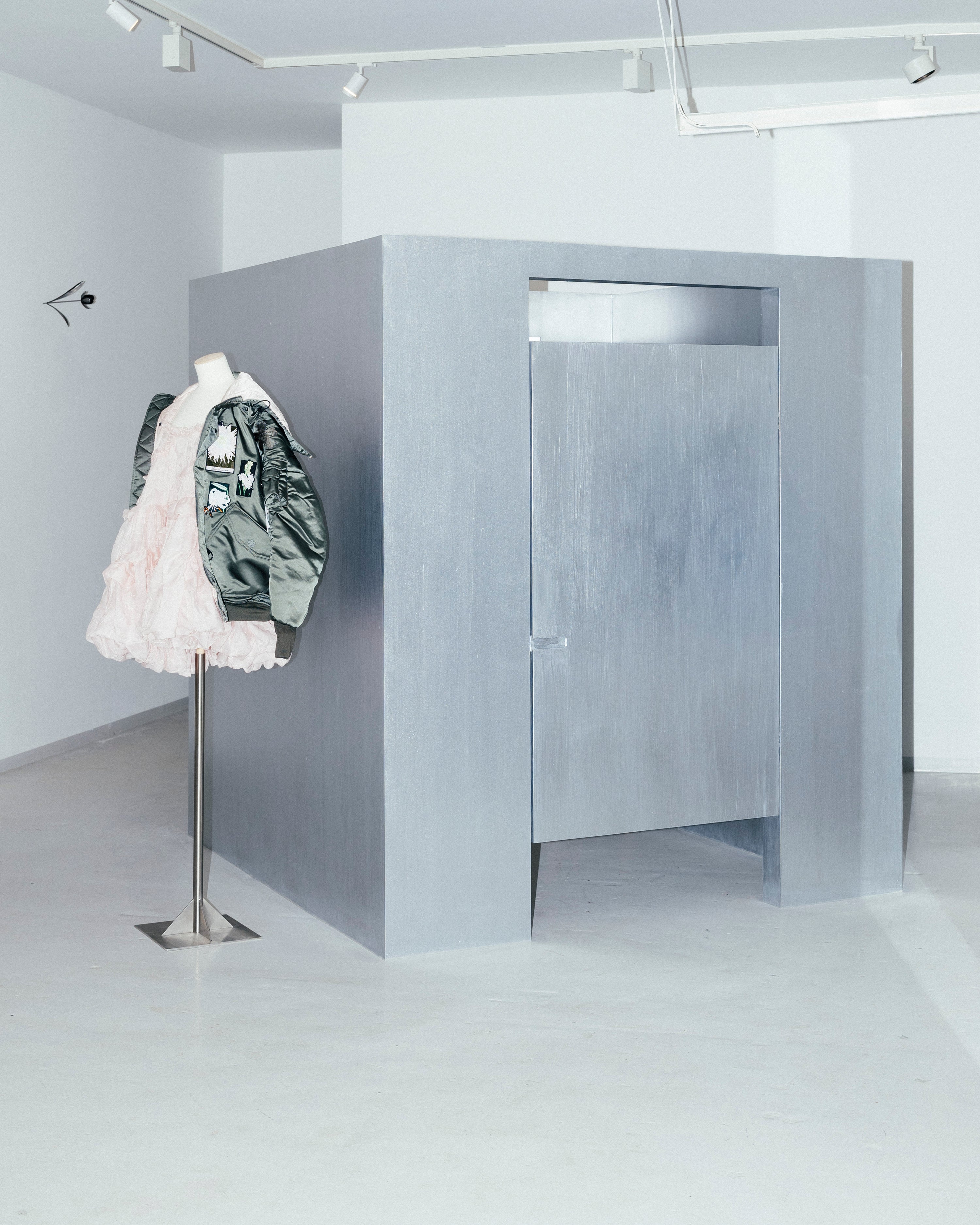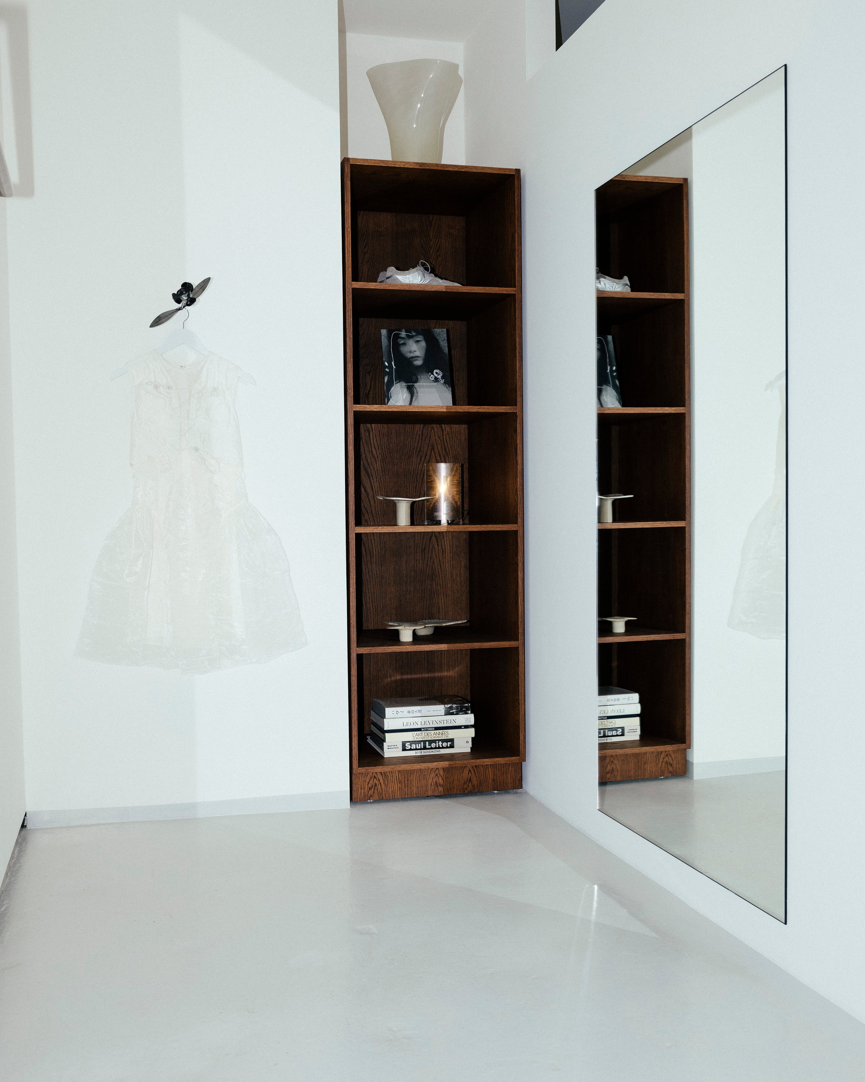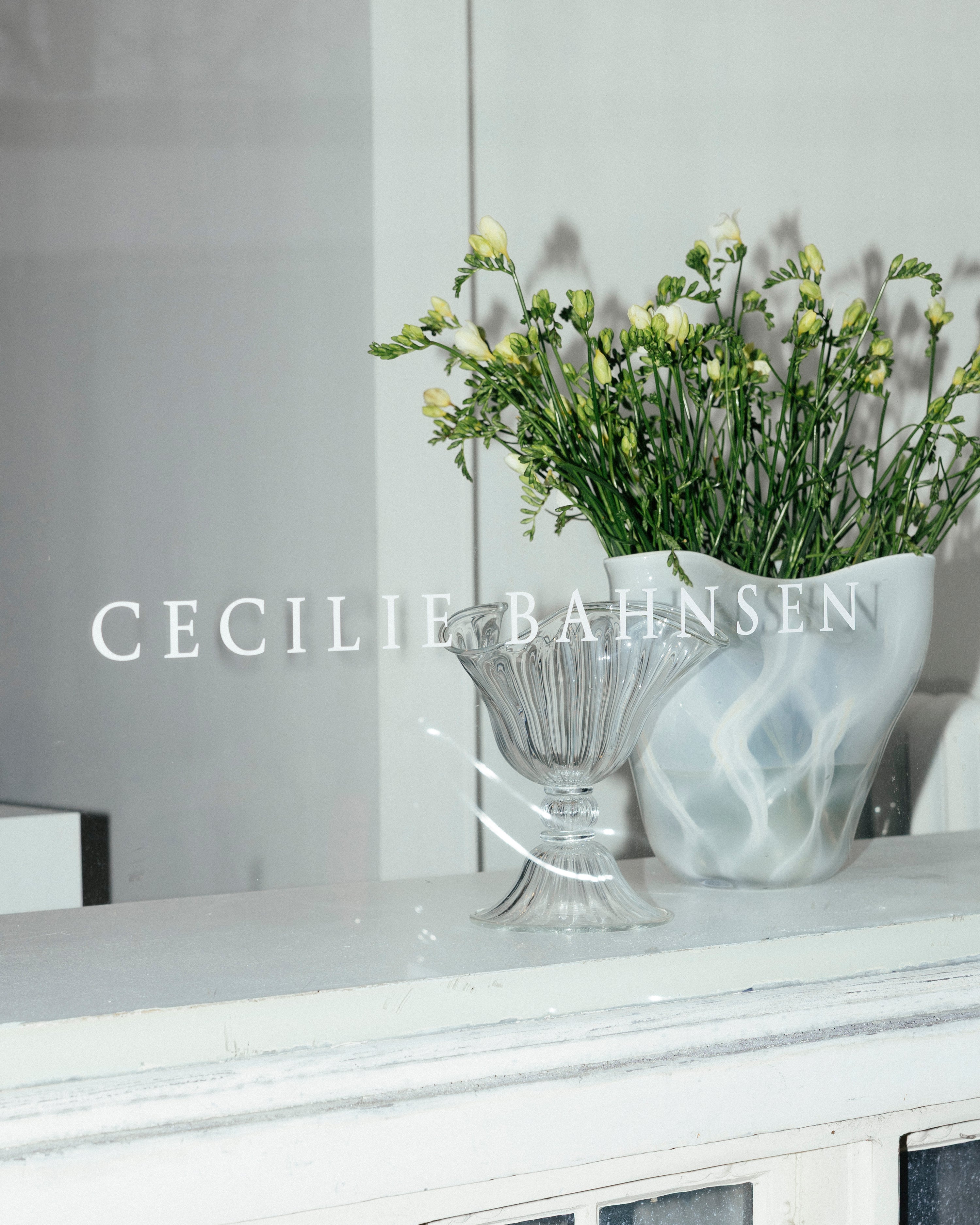 The interior is painted in CE BA 08 Gianna White and CE BA 11 Jeorge Silver, two tones developed by Cecilie Bahnsen for Blēo, creating a soft, balanced setting and a simple backdrop for the collection.