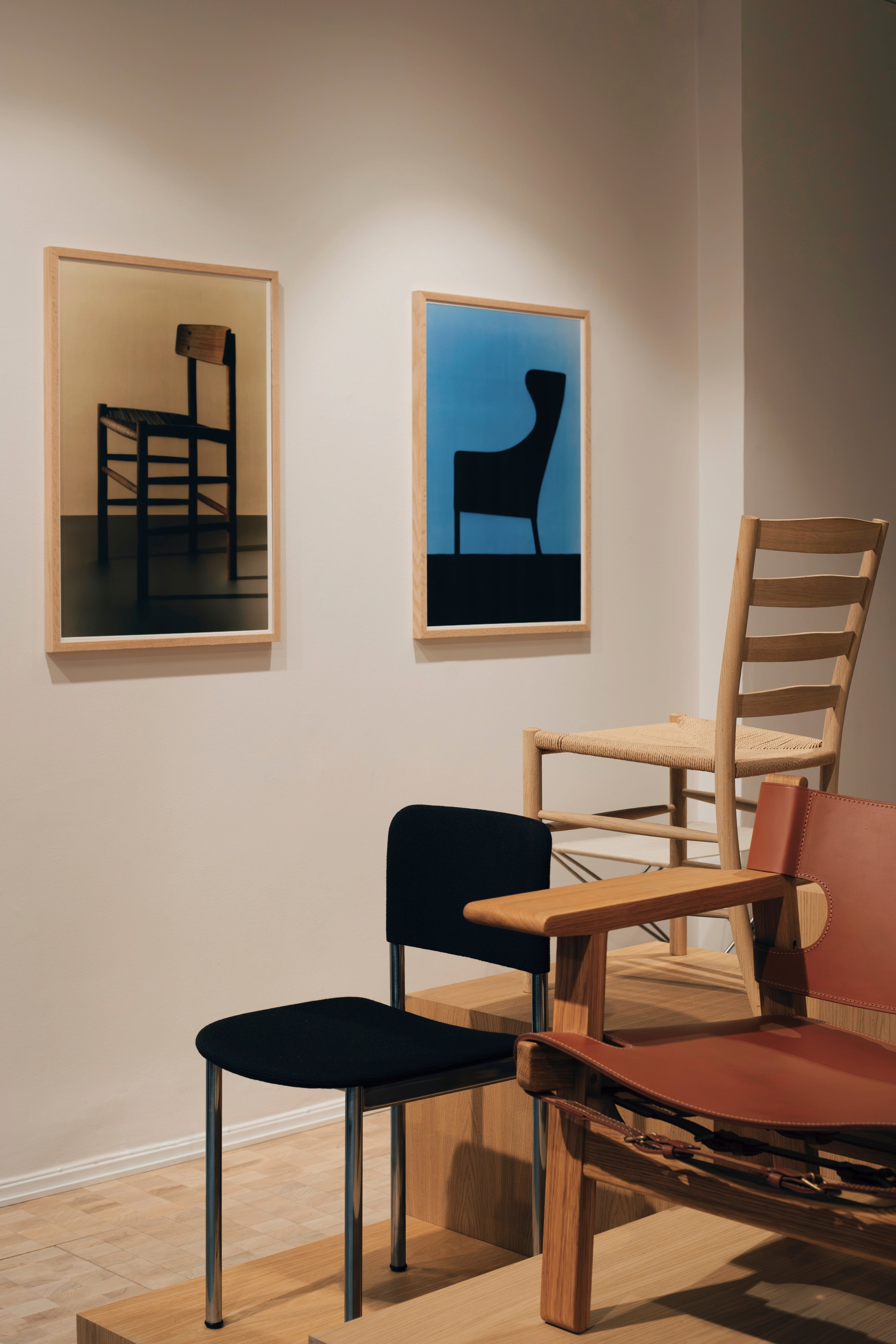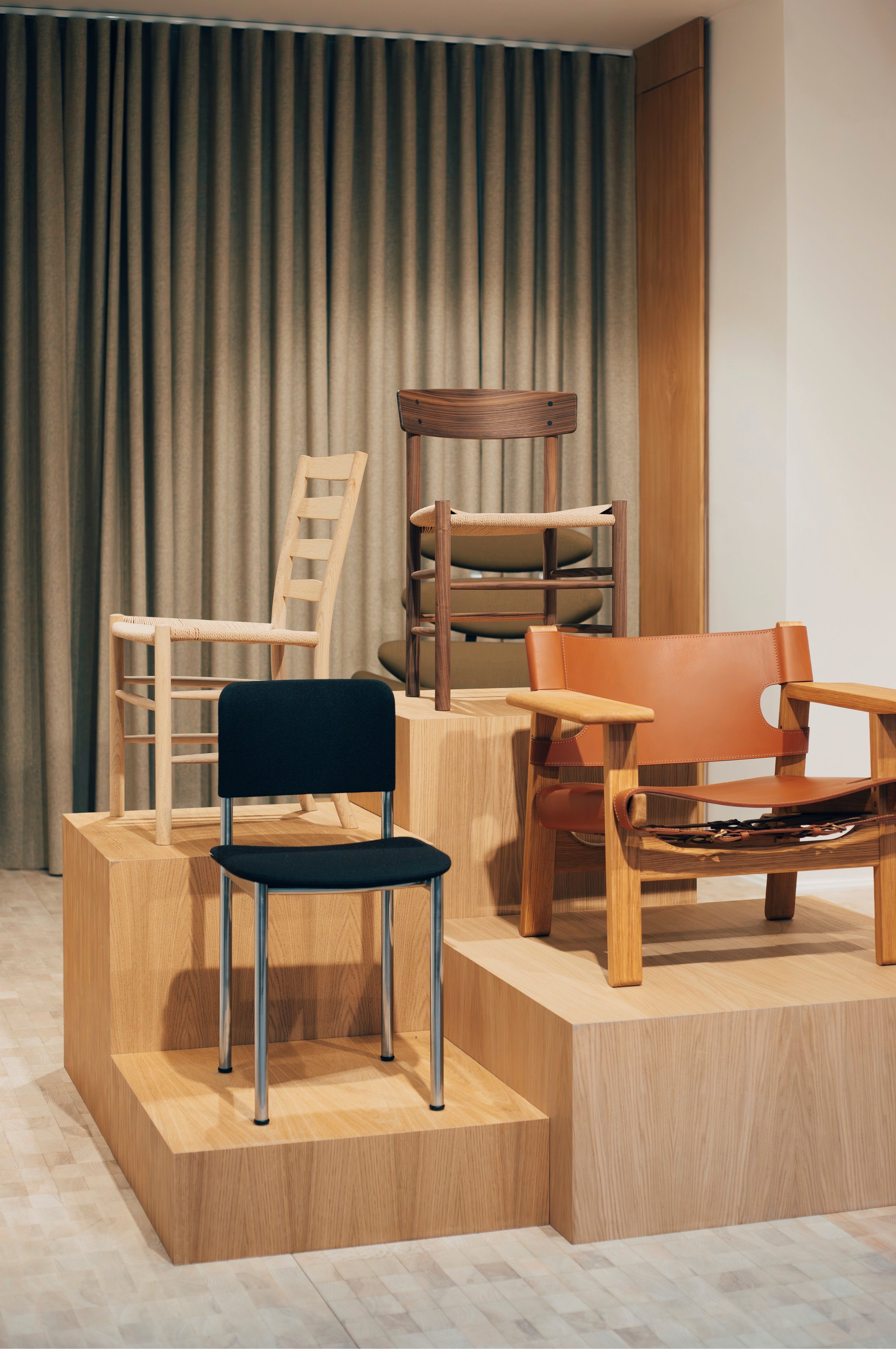Throughout the showroom, walls are painted in CE MA 03 Washi by Cecilie Manz for Blēo, a tone inspired by the soft texture and translucency of handmade Japanese paper. Subtle and tactile, the colour lends warmth to daylight and depth to Fredericia’s natural materials — oak, leather, wool, and steel — allowing the furniture to appear grounded yet gently illuminated.