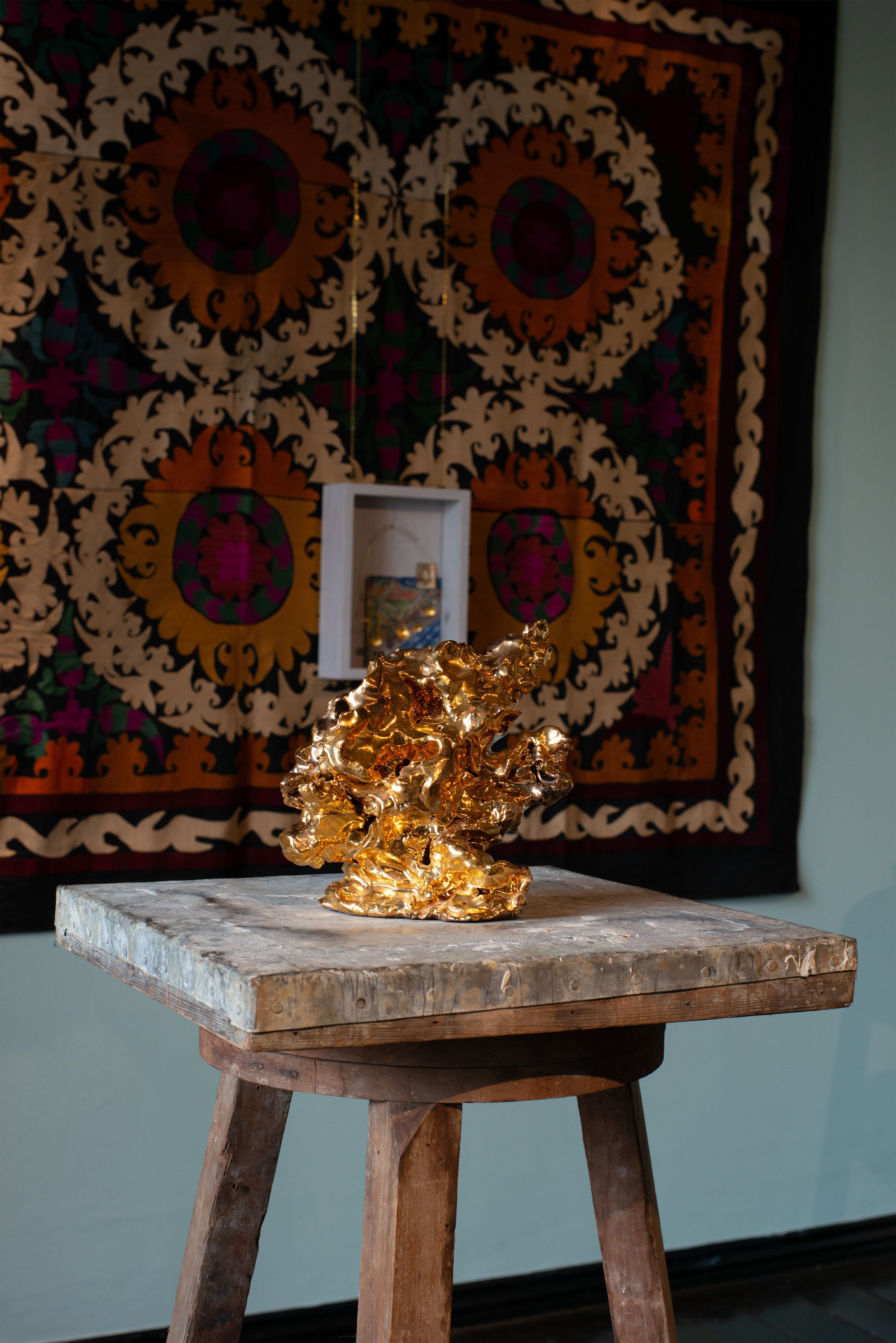 Walls and ceilings are painted in different tones from Transition — the colour palette developed by Griegst for Blēo — forming a quiet chromatic backdrop to this expressive environment.