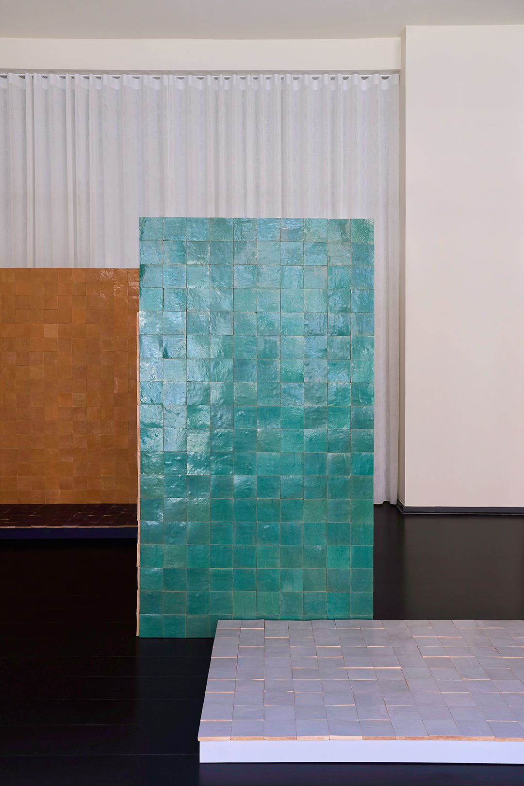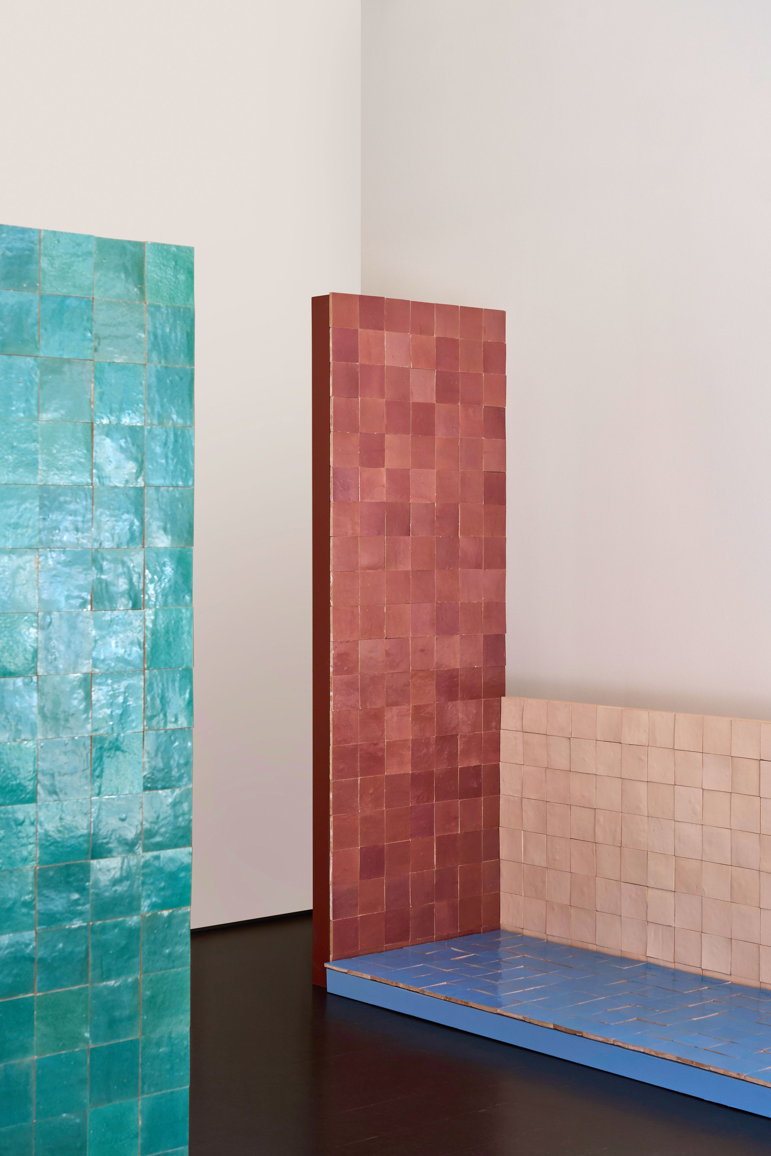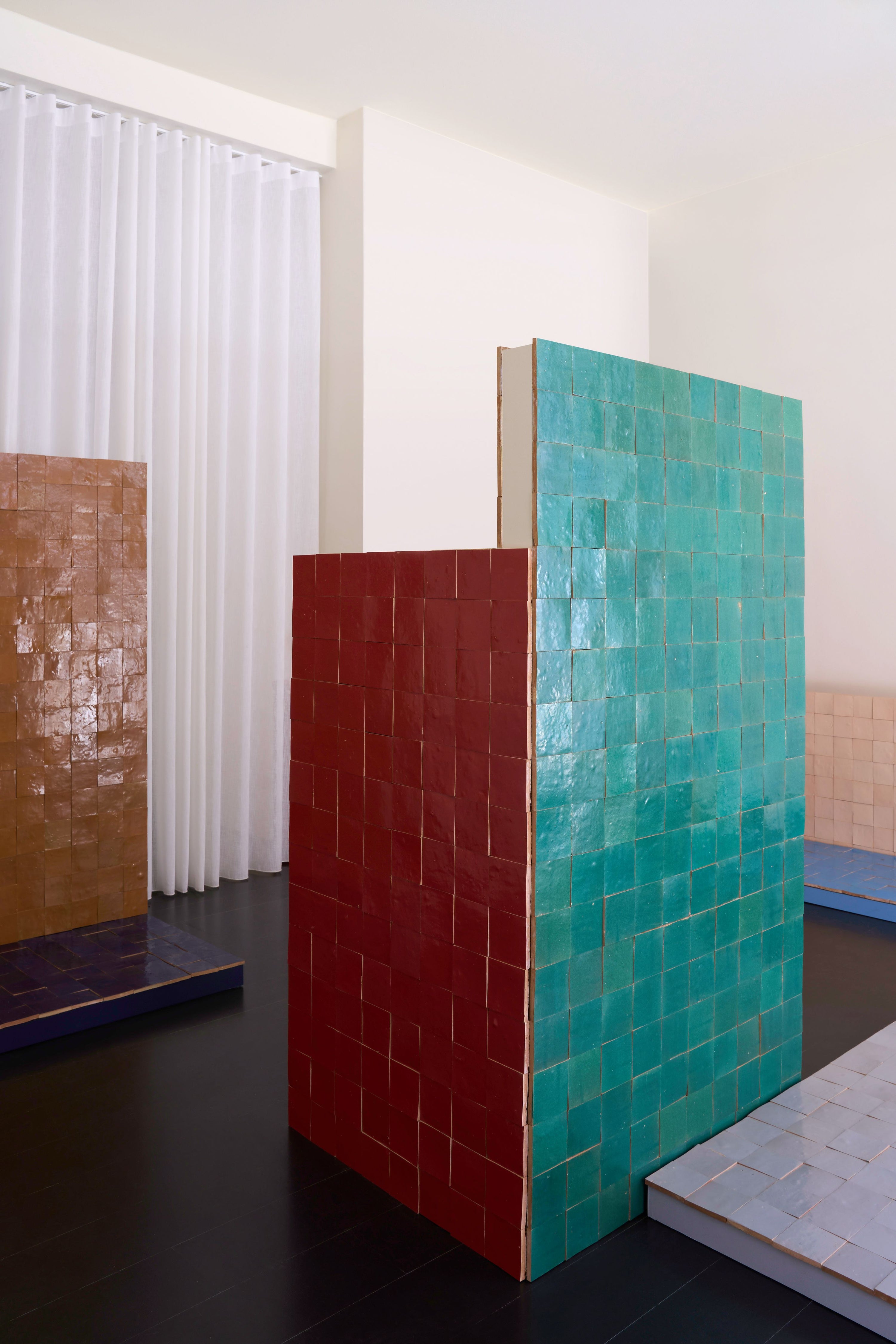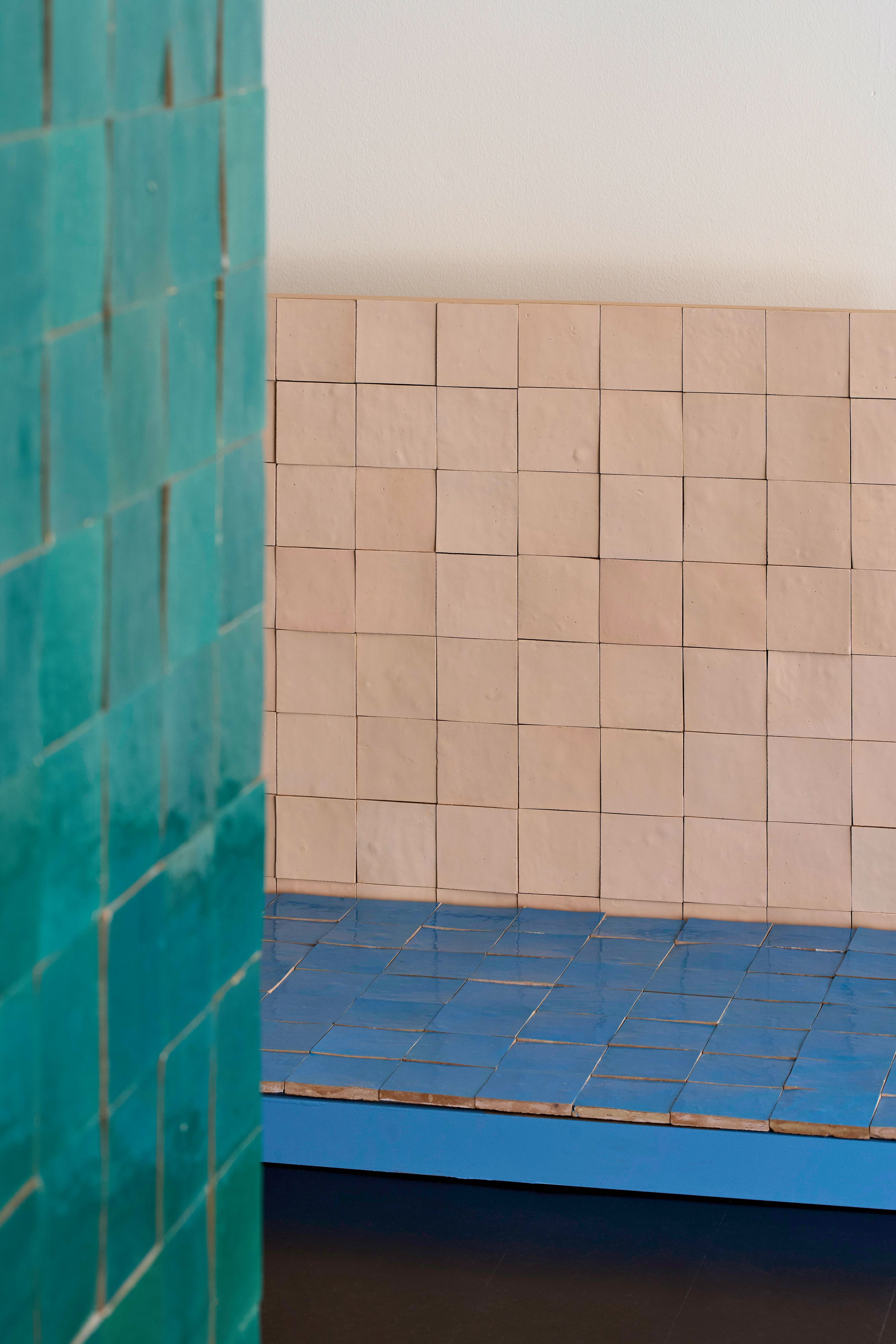 Tiles by Muller Van Severen is a tactile exploration of colour, material, craft and tradition — shaped by centuries of craftsmanship and the designers’ distinct visual language. The tiles are made using traditional techniques rooted in the artisanal legacy of Fez, Morocco, where handmade glazed tiles have been produced for generations. Each tile begins with pure, locally sourced clay, shaped and glazed entirely by hand using mineral-based pigments. The vibrant and nuanced colours on the tiles come from natural mineral oxides mixed into the glaze. The process of forming, firing, and cutting follows age-old methods passed down through family workshops, ensuring that every piece reflects the nuance and vitality of its making.