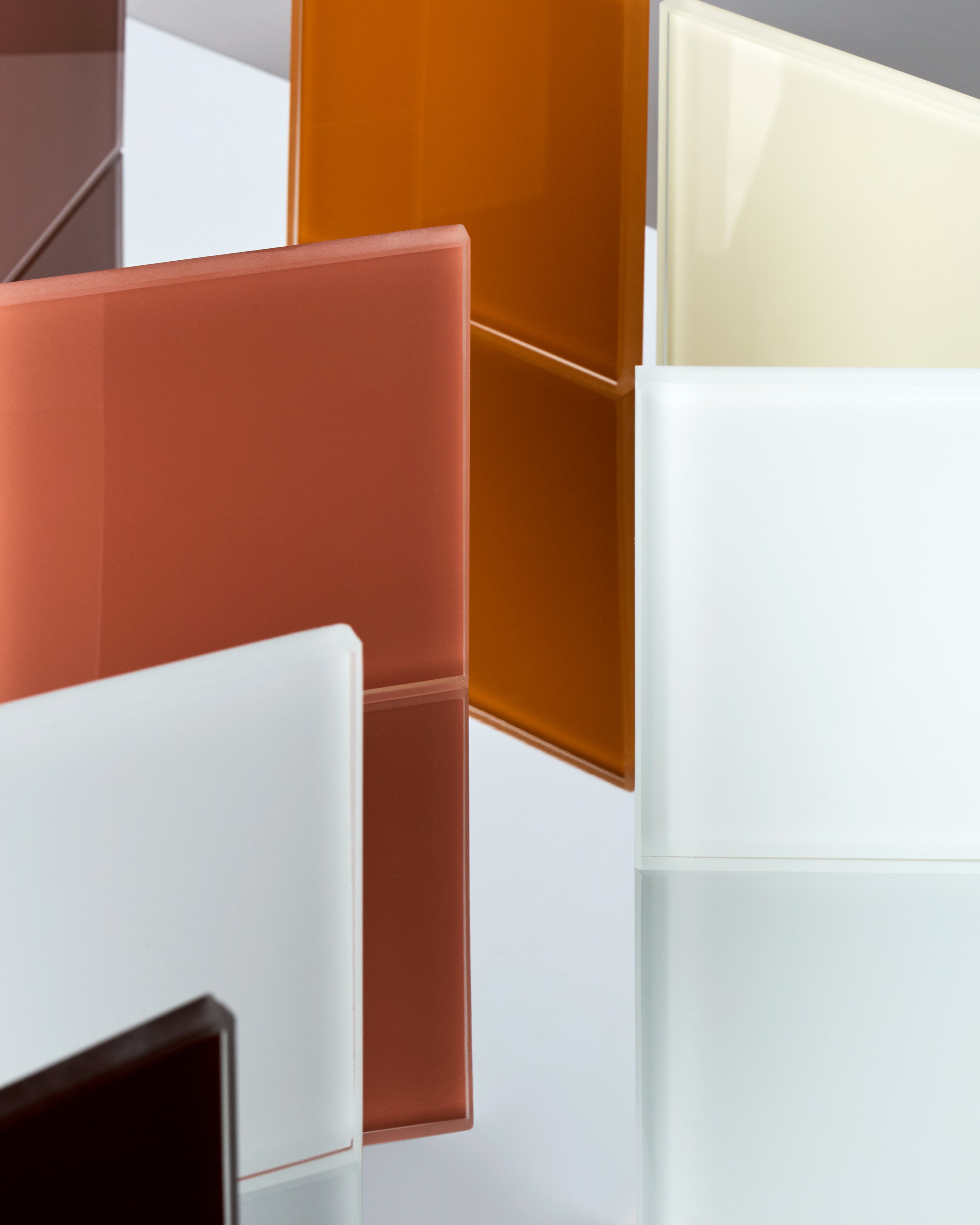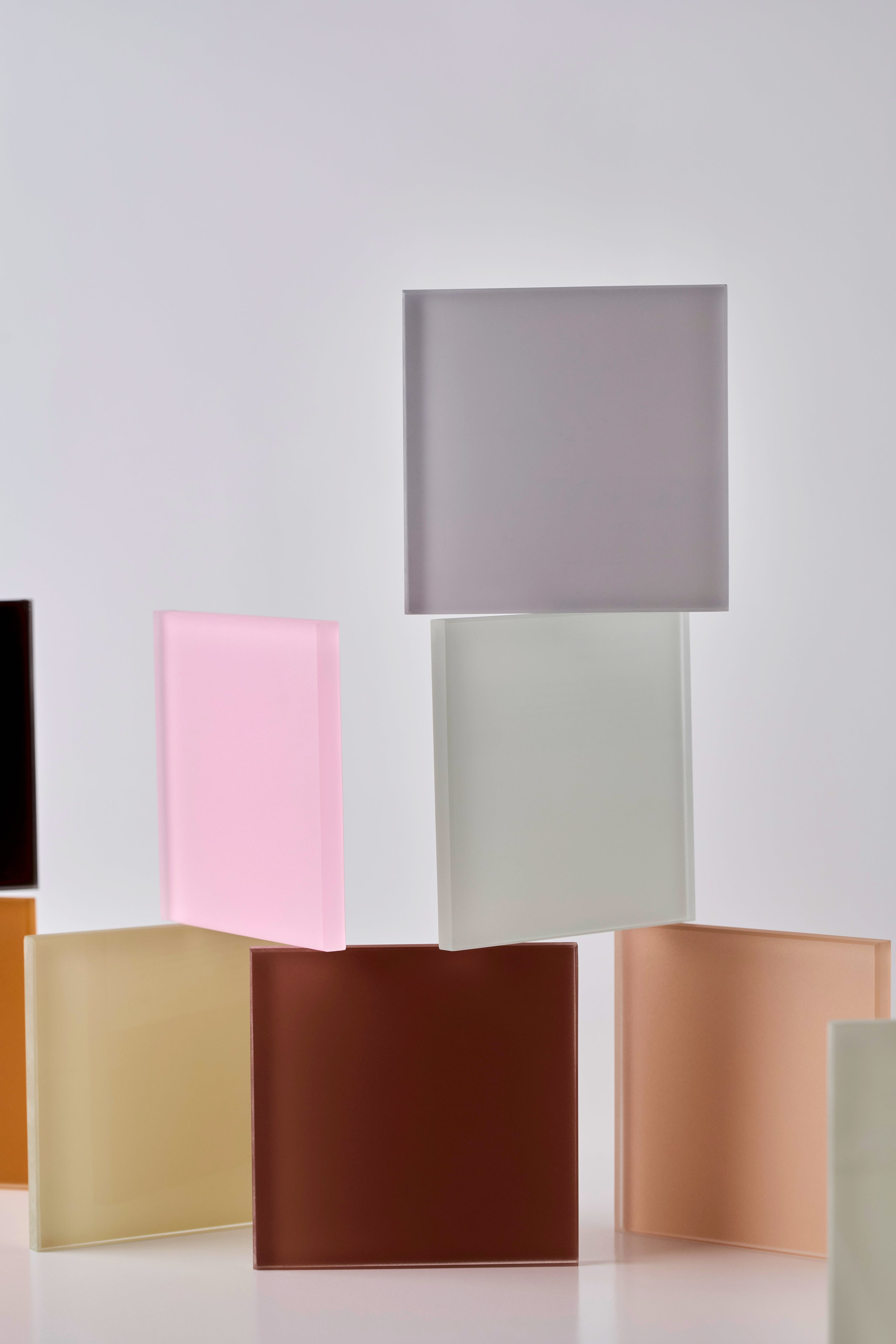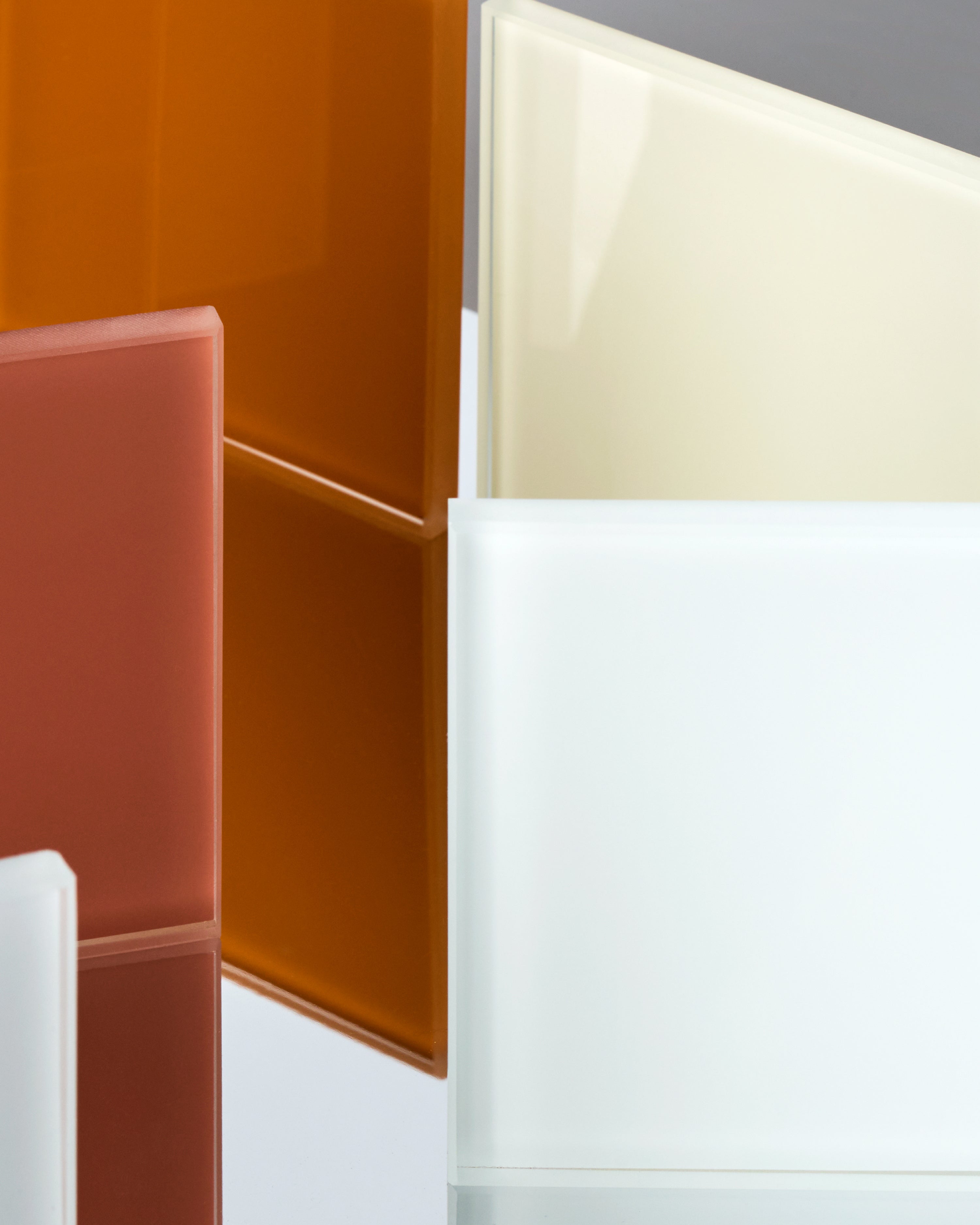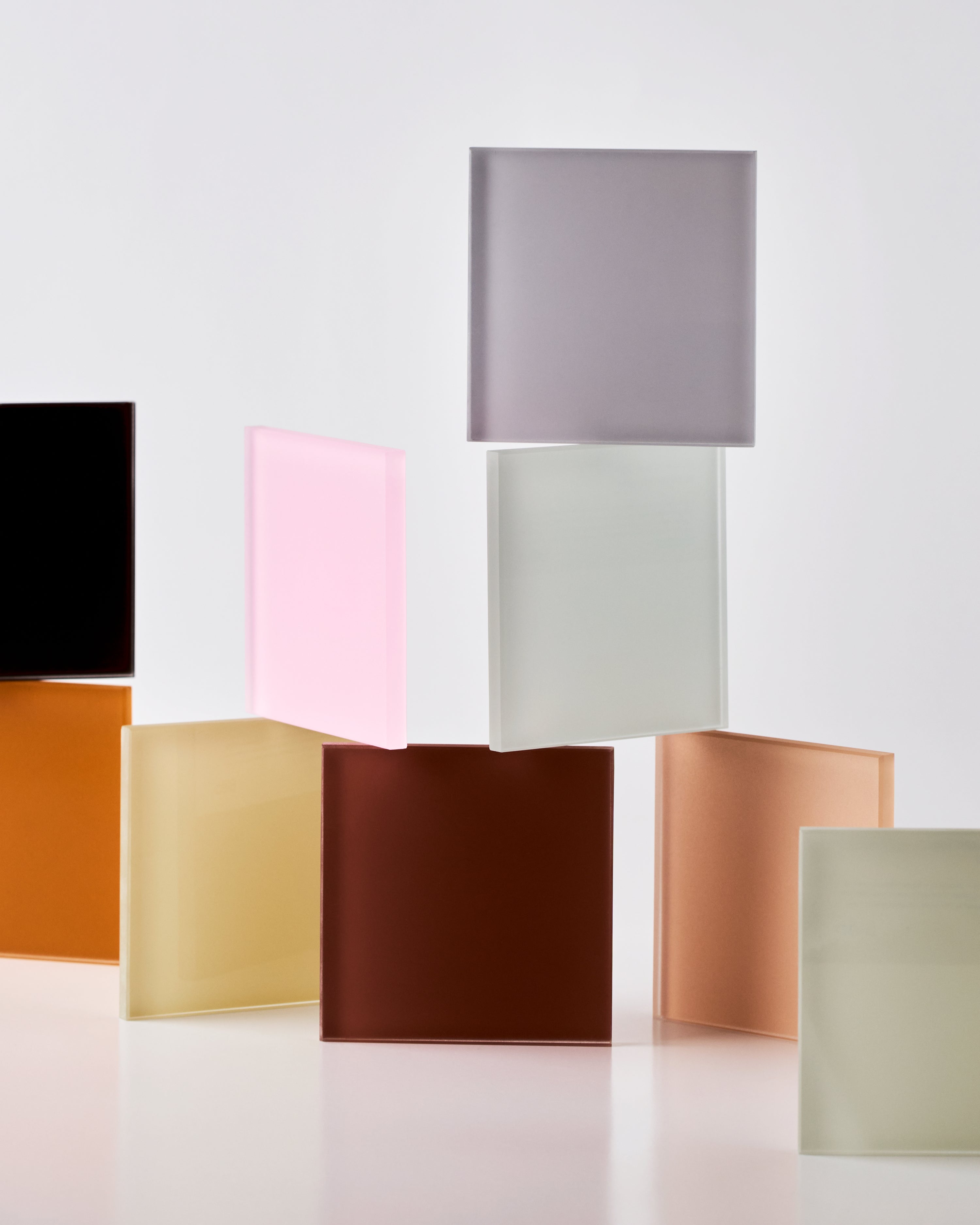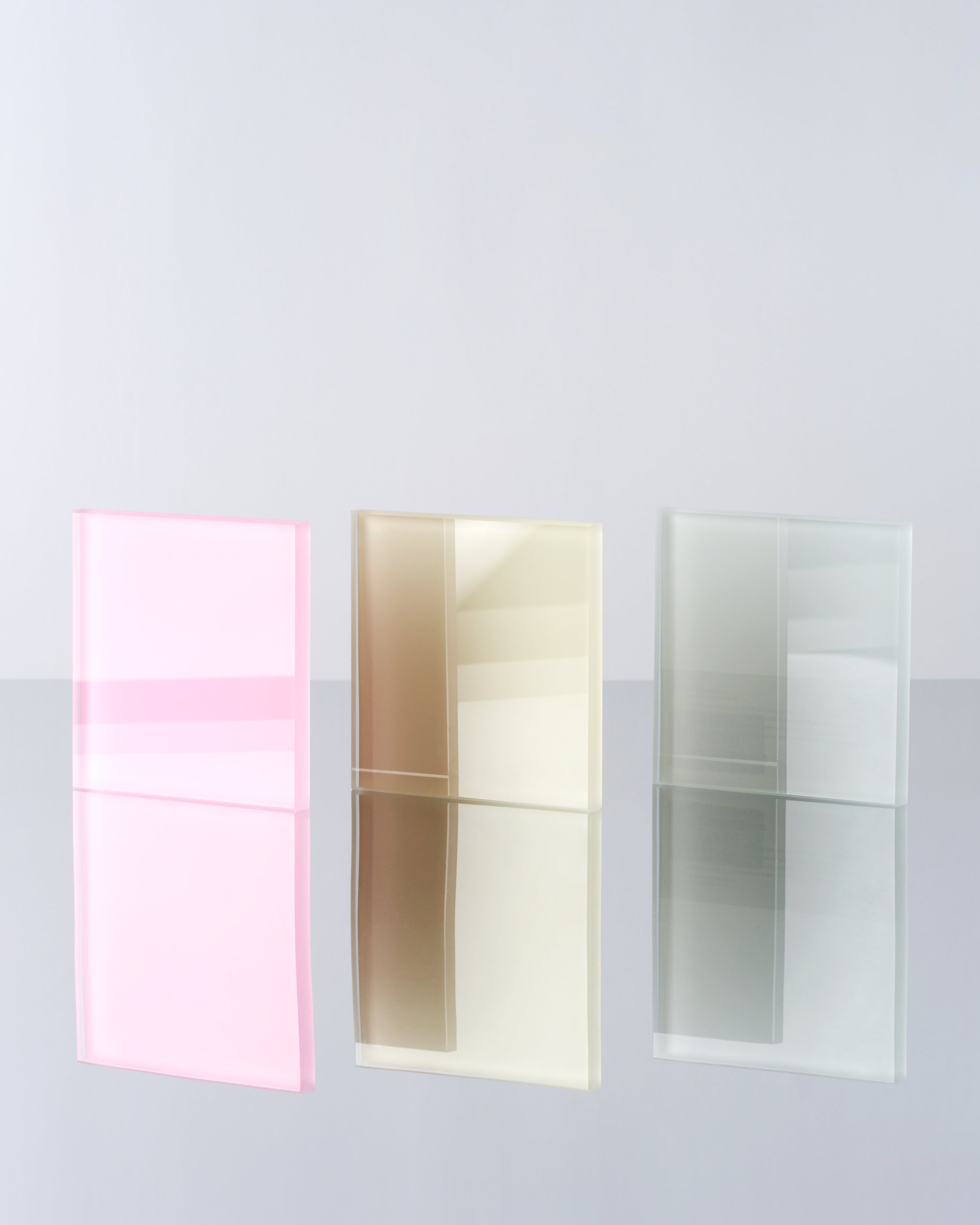 Available in two distinct finishes: a frosted matte that diffuses light with quiet softness, and a glossy surface that plays with reflection and clarity. Colour is applied to the reverse of the glass in a uniform layer, achieving perfect consistency while the material’s translucency adds a sense of depth — grounded in stone, yet elevated by light.