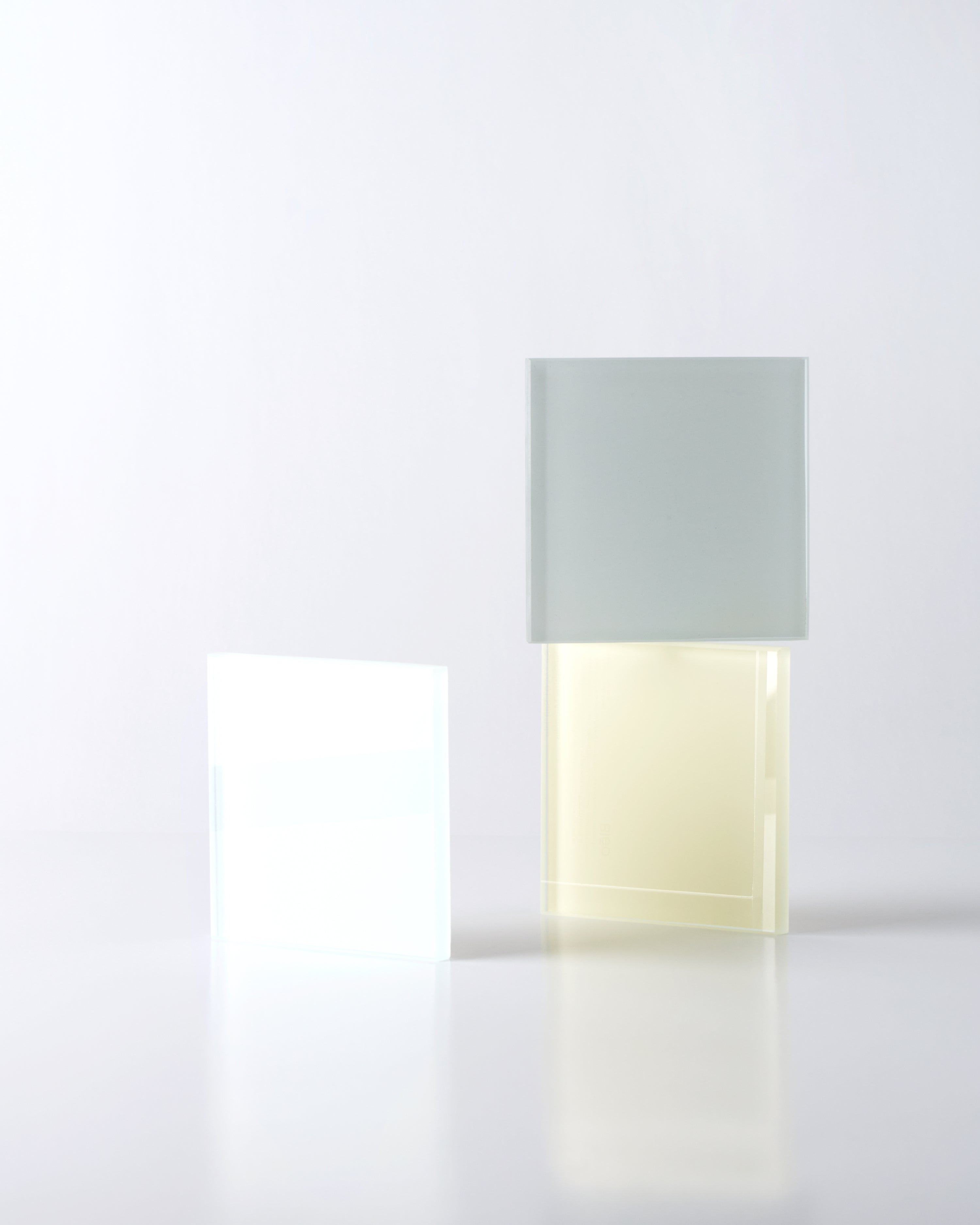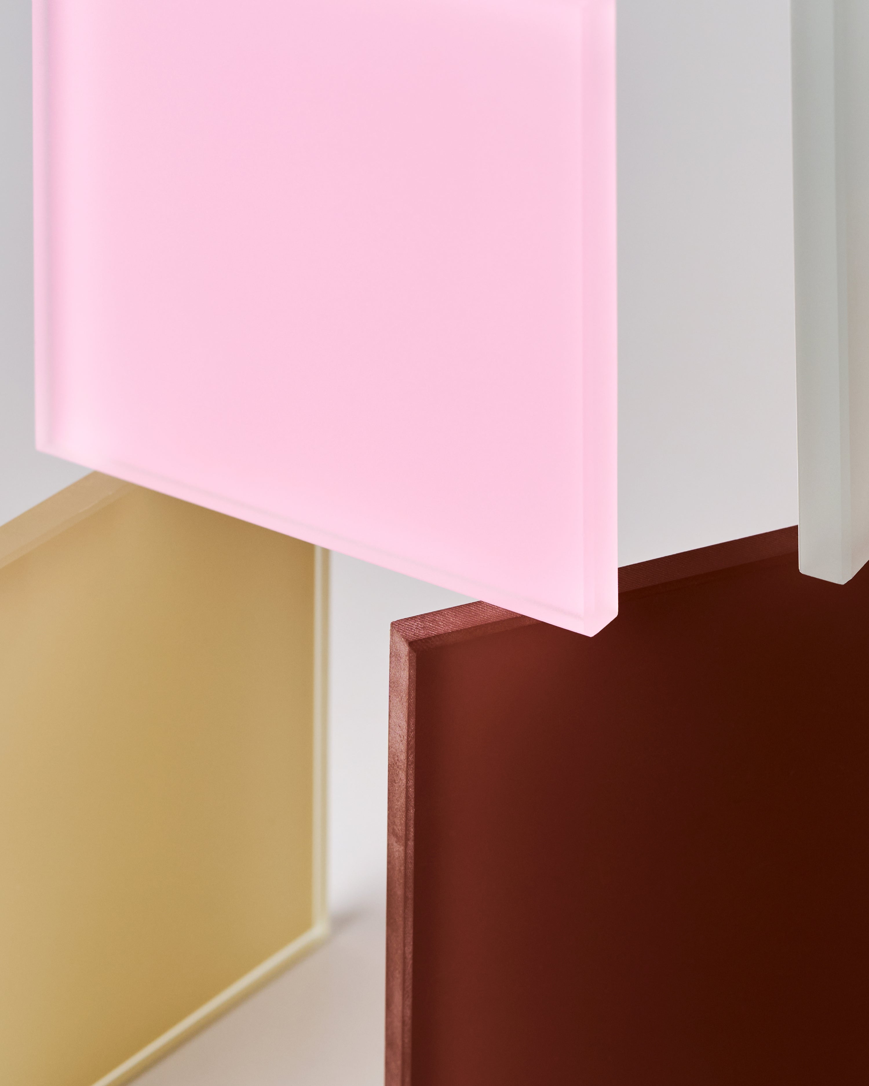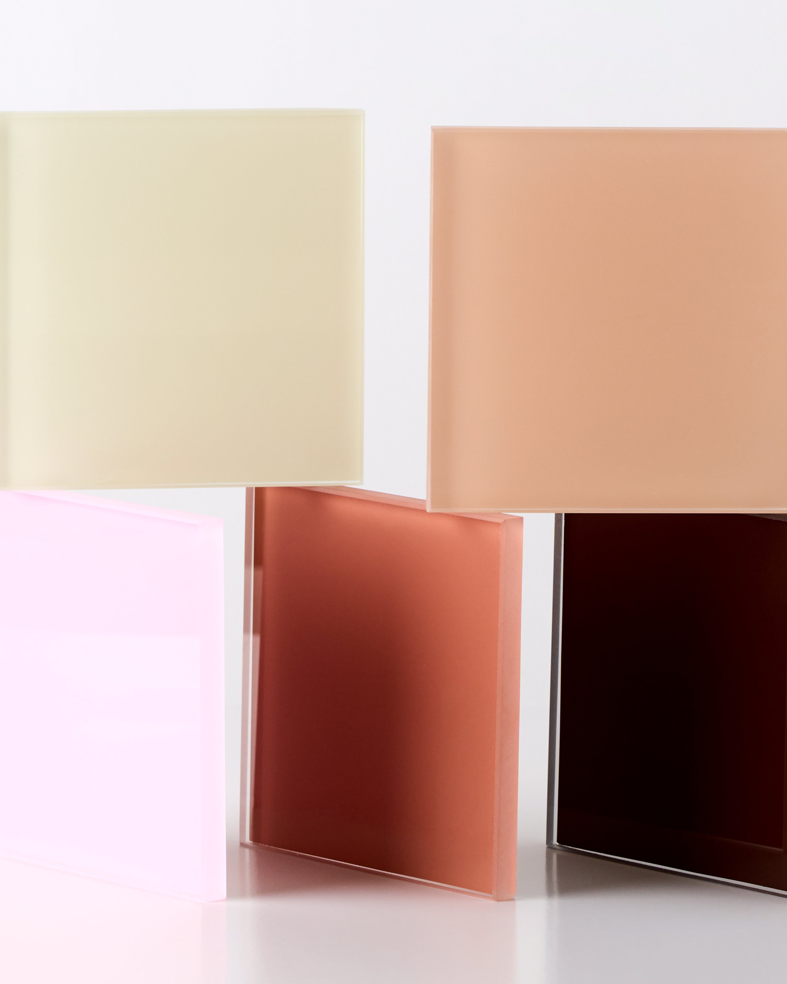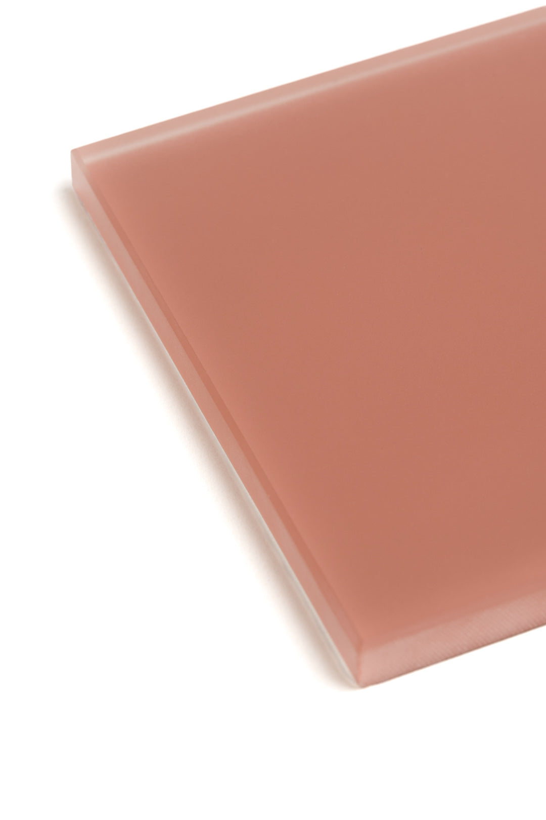 Available in two distinct finishes: a frosted matte that diffuses light with quiet softness, and a glossy surface that plays with reflection and clarity. Colour is applied to the reverse of the glass in a uniform layer, achieving perfect consistency while the material’s translucency adds a sense of depth — grounded in stone, yet elevated by light.