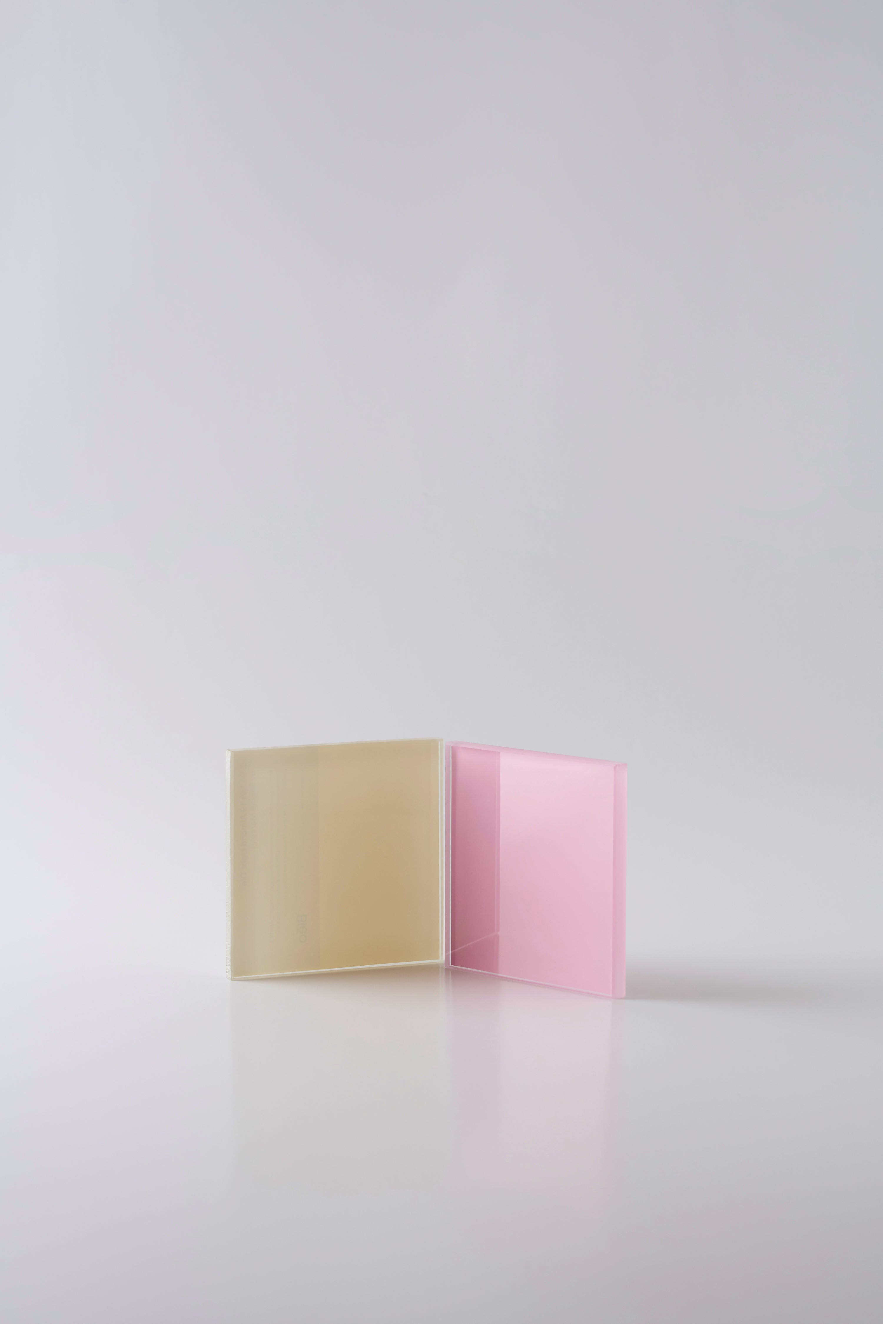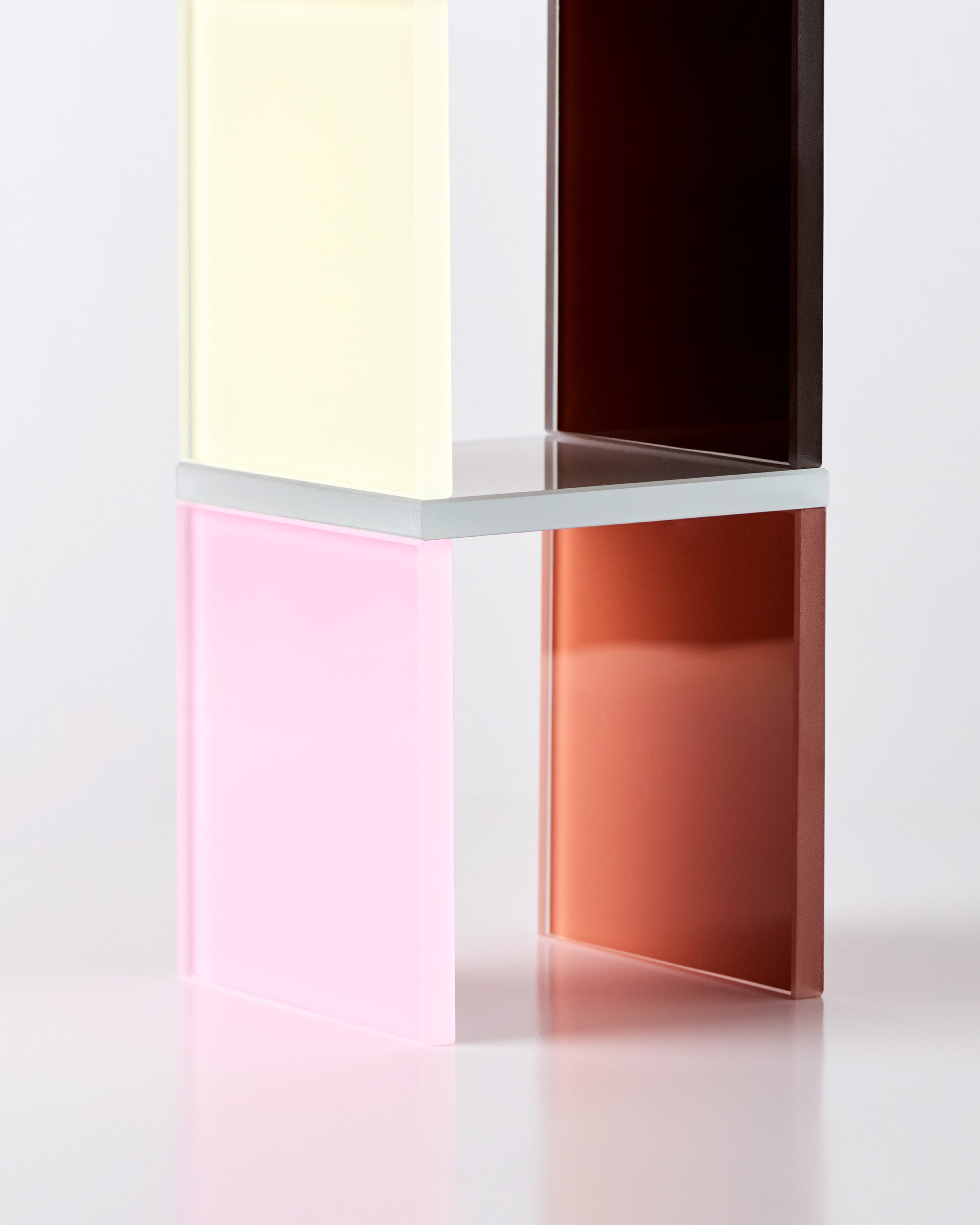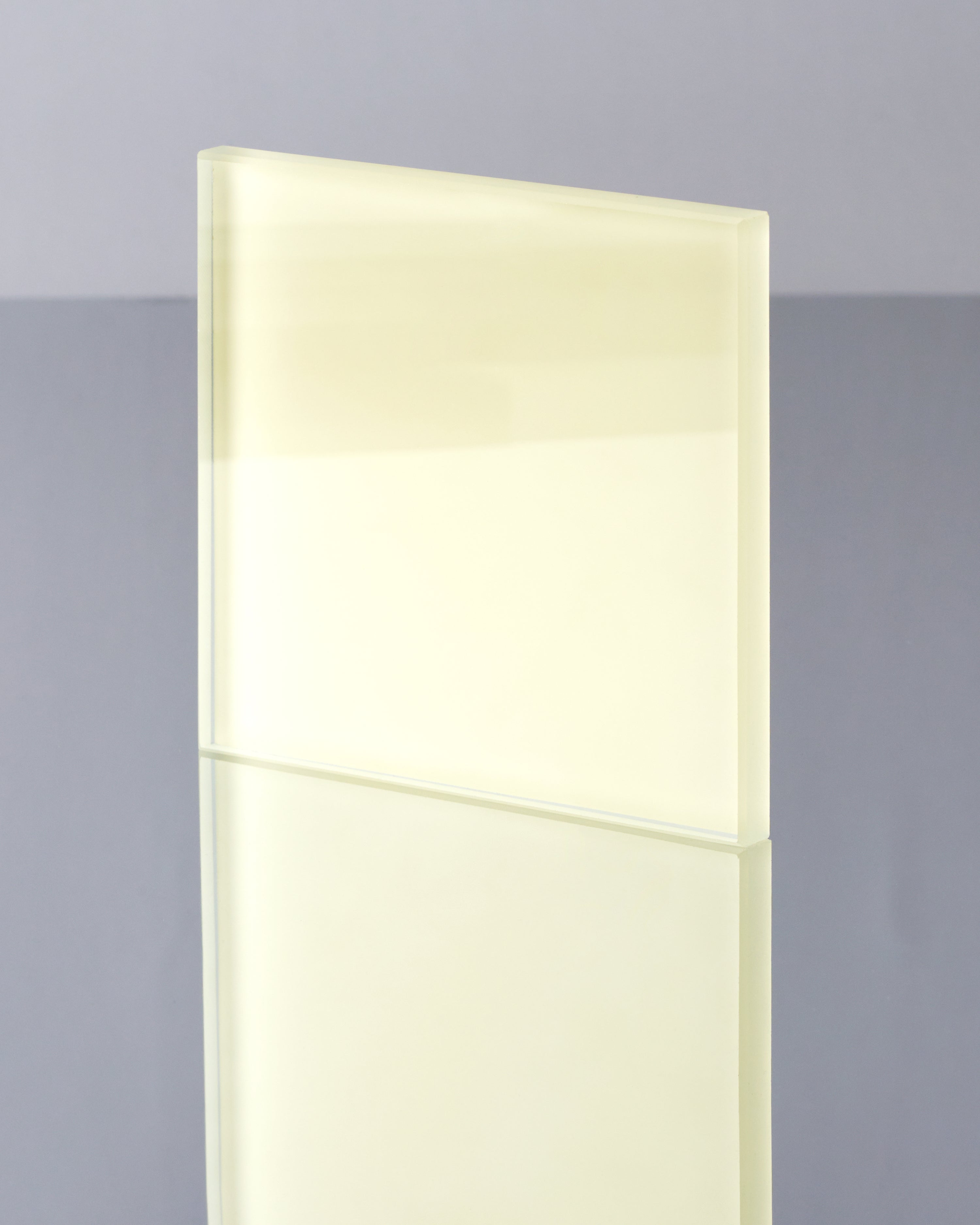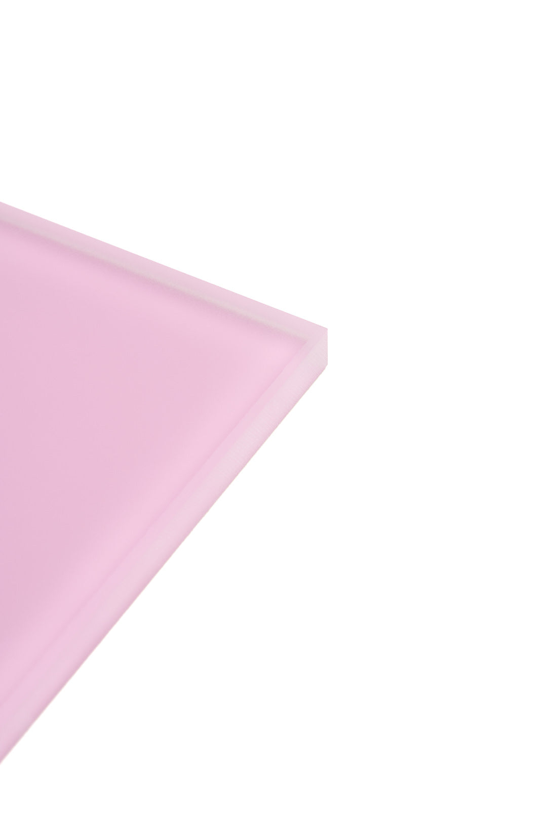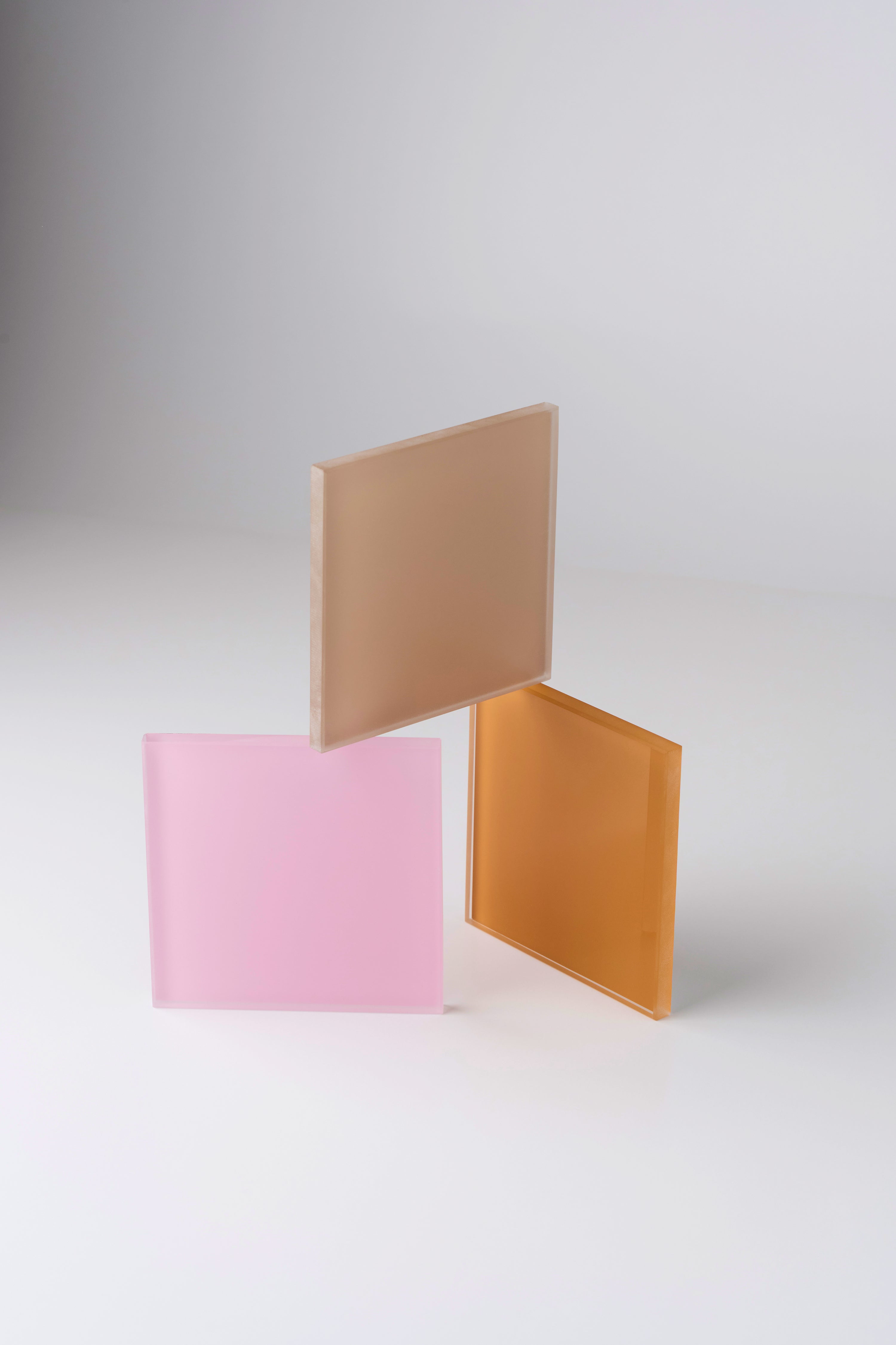 Available in two distinct finishes: a frosted matte that diffuses light with quiet softness, and a glossy surface that plays with reflection and clarity. Colour is applied to the reverse of the glass in a uniform layer, achieving perfect consistency while the material’s translucency adds a sense of depth — grounded in stone, yet elevated by light.
